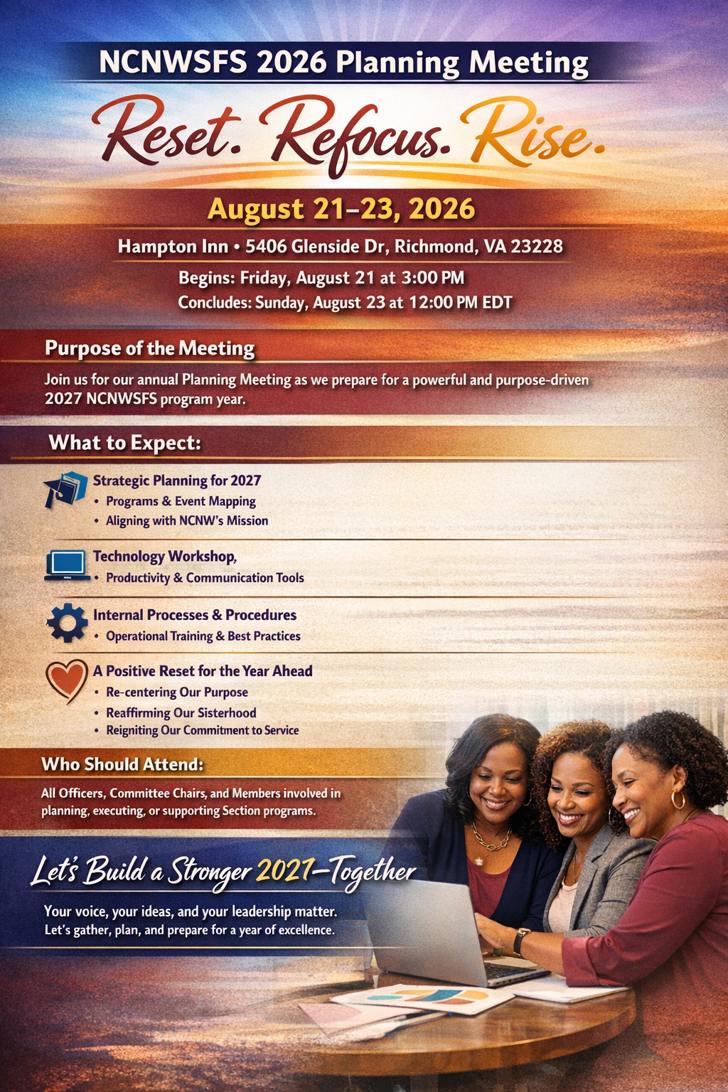 Join us for our annual Planning Meeting as we prepare for a powerful and purpose-driven 2027 NCNWSFS program year. This retreat-style working session will allow us to align, innovate, and strengthen the foundation of our Section’s events, initiatives, and community impact.